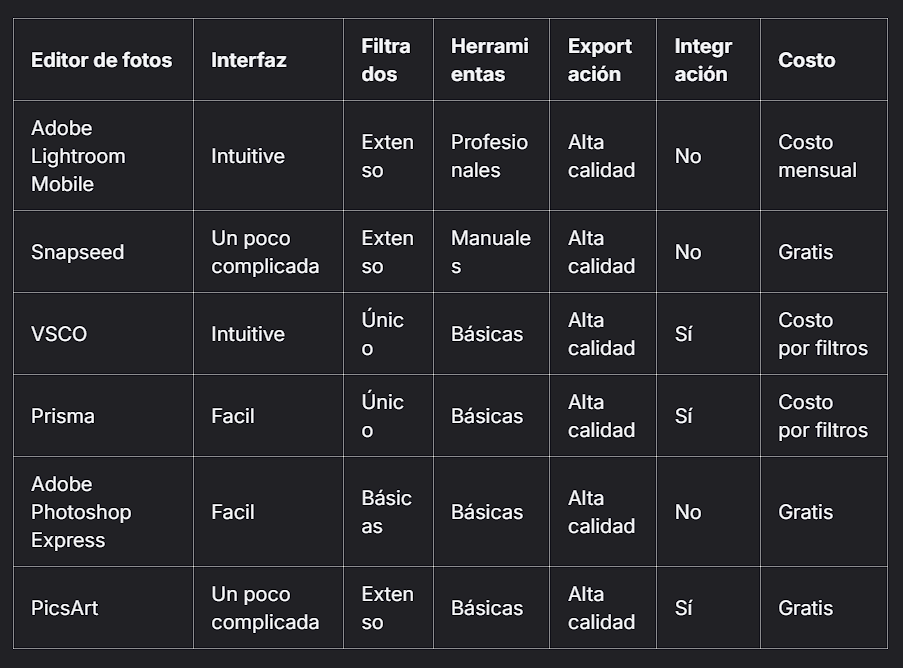 En la comparativa de editores de fotos móviles, hay opciones gratuitas y pagas que pueden satisfacer diferentes necesidades y presupuestos. Considerando criterios específicos de valoración, podemos concluir que Adobe Lightroom Mobile es el editor de fotos móvil más completo y profesional, mientras que Snapseed ofrece una amplia gama de herramientas avanzadas y de uso fácil. Otros editores como VSCO, Prisma, Adobe Photoshop Express y PicsArt también tienen sus ventajas y desafortunadamente, cada usuario debe evaluar sus necesidades y elegir el editor de fotos móvil que mejor se adapte a ellas.