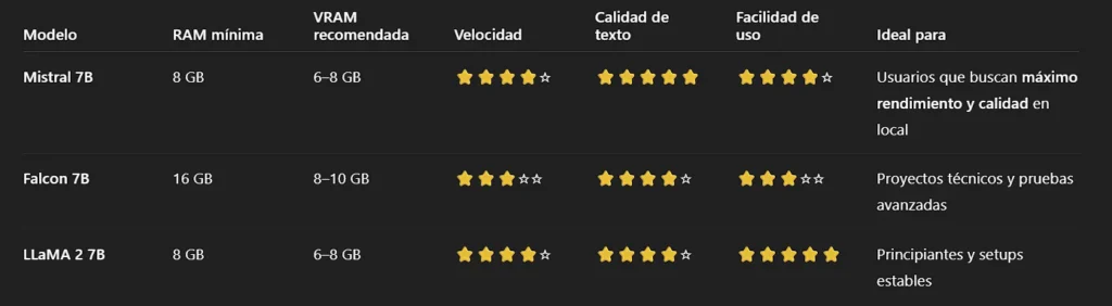 Mistral 7B es actualmente el mejor modelo 7B para uso local en términos de rendimiento, calidad de texto y eficiencia. Funciona bien incluso en equipos con recursos moderados y supera a Falcon 7B y LLaMA 2 en tareas generales.